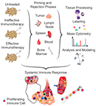 Immune responses involve coordination across cell types and tissues. However, studies in cancer immunotherapy have focused heavily on local immune responses in the tumor microenvironment. To investigate immune activity more broadly, we performed an organism-wide study in genetically engineered cancer models using mass cytometry. We analyzed immune responses in several tissues after immunotherapy by developing intuitive models for visualizing single-cell data with statistical inference. Immune activation was evident in the tumor and systemically shortly after effective therapy was administered. However, during tumor rejection, only peripheral immune cells sustained their proliferation. This systemic response was coordinated across tissues and required for tumor eradication in several immunotherapy models. An emergent population of peripheral CD4 T cells conferred protection against new tumors and was significantly expanded in patients responding to immunotherapy. These studies demonstrate the critical impact of systemic immune responses that drive tumor rejection. |