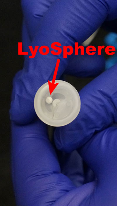 Slowly rotate the Smart Tube. The LyoSphere will roll around the inside surface of the Smart Tube and drop through the hole